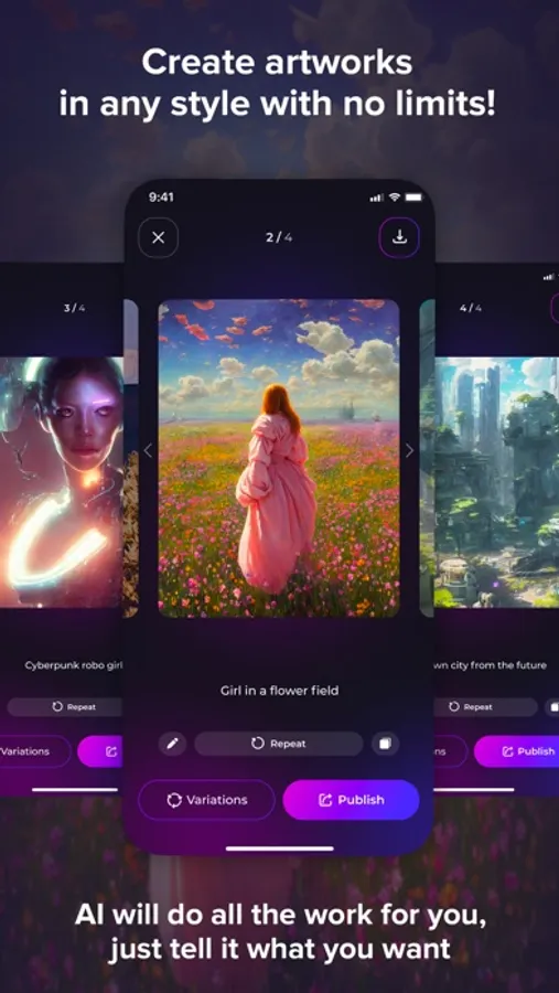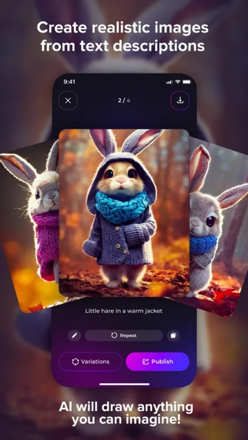 Our latest update has also brought in a new functionality for creating variations of art. You can use your own photos or images generated within the app to create unique variations of art. With Magicly, you can generate spectacular artwork from words using the latest AI technology, all at the click of a button. Just enter a text prompt and let Magicly produce an image that's entirely new and astonishingly beautiful. Produce stunning, original works of art with AI and your imagination.