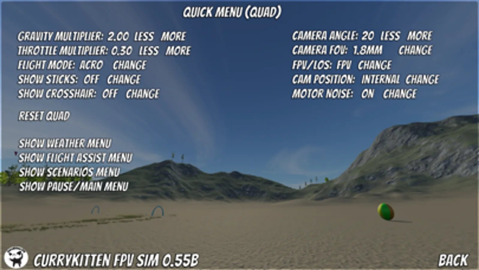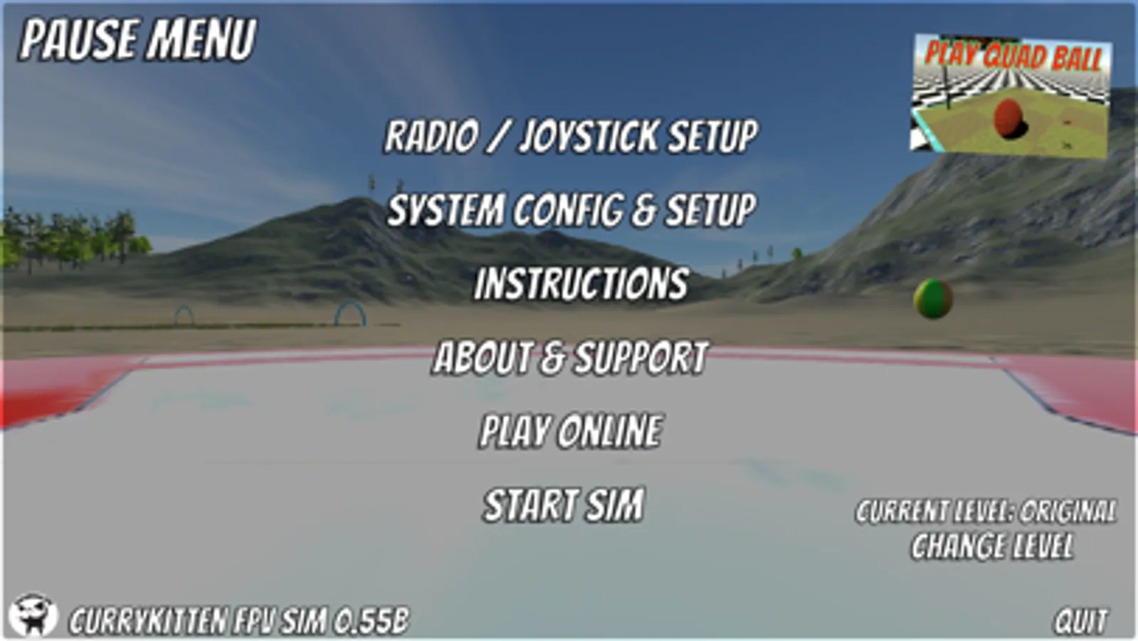 Lastly, there is Quad Ball, a fully-featured game within the sim! In Quad Ball you have to use your quadcopter to get the ball to the goal... ram the ball in just the right way to reach the goal, but be careful, overcook your hit and the ball might fall out of play.