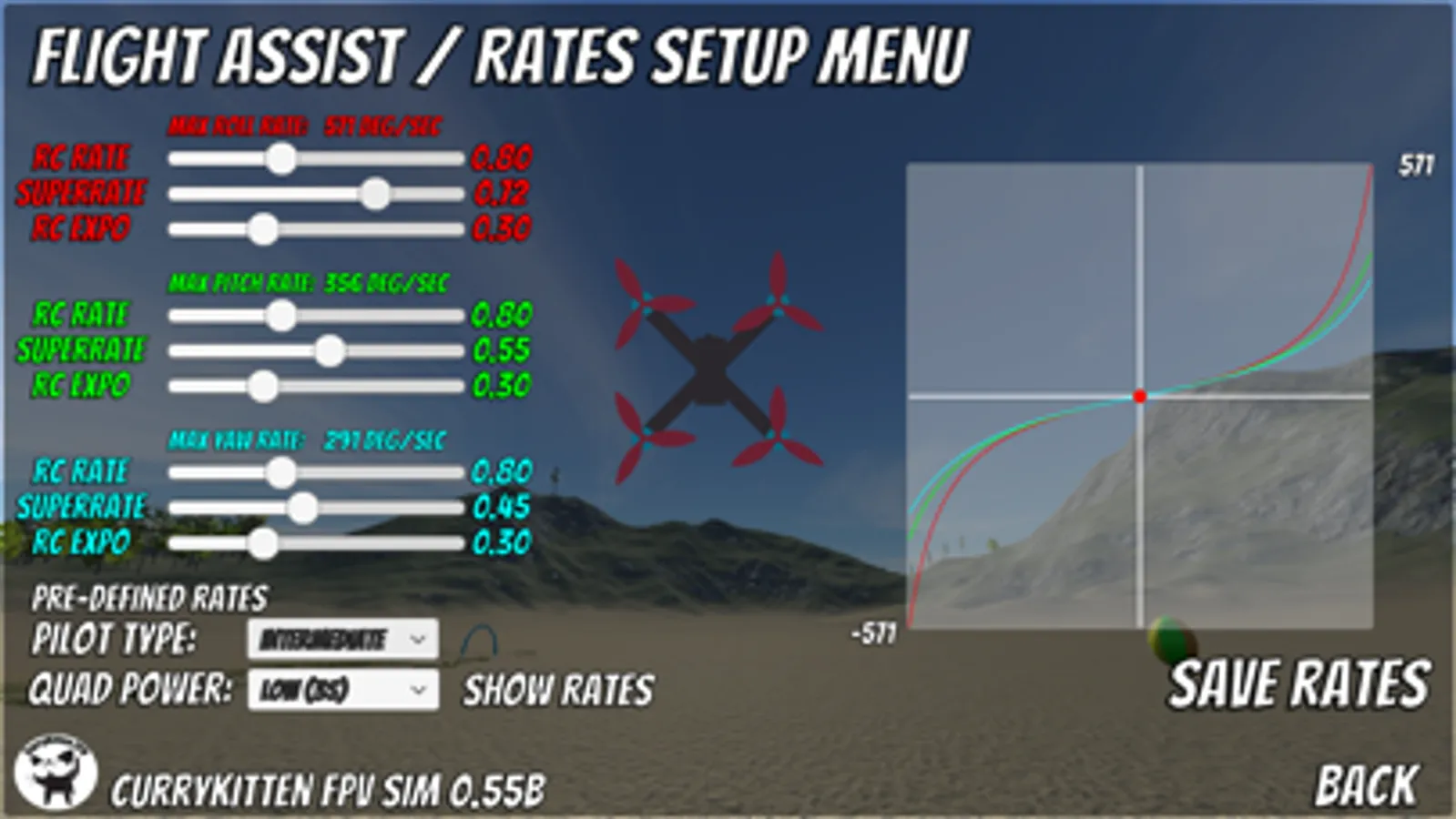 Full setup for your quad (or plane) is provided so you can set things up as gentle or aggressive as you like. Some pre-defined rates are also supplied if you want to simplify things.