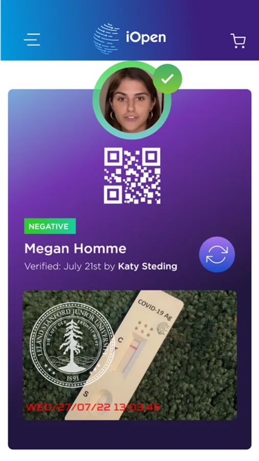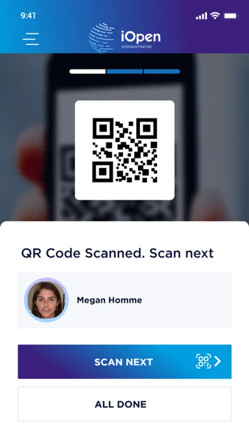 3. Enjoy access to any controlled venue entrance and travel with peace of mind. iOpen users present their QR code for scanning with an ID when entering any controlled event requesting validation.