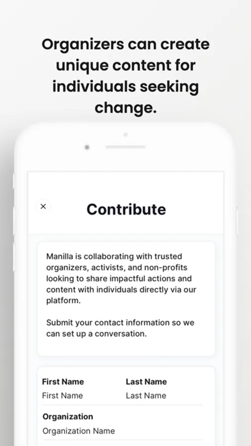 Are you an organizer? Manilla is collaborating with trusted organizers, activists, and non-profits looking to share impactful actions and content with individuals directly via our platform.