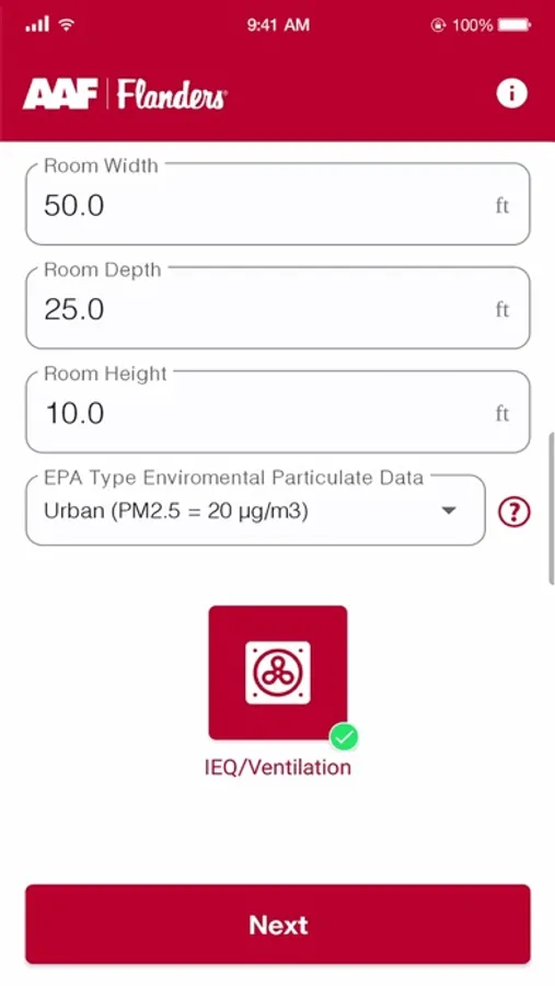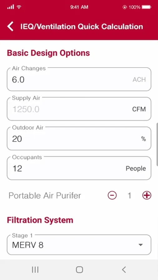 The VisionAir IEQ app is an easy-to-use calculator tool derived from the VisionAir IEQ software. As in the full version of the software, the app uses a state-of-the-art calculation method based on air filtration expertise gained over a century of bringing clean air to life. The app allows a user to estimate the particle concentration within a space in a few simple steps. Calculations are performed based upon the entry of variables such as filtration efficiency, number of people occupying the space, internal contamination generation, and outdoor air pollution.