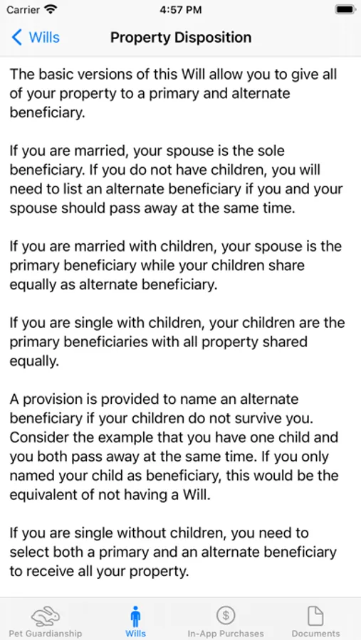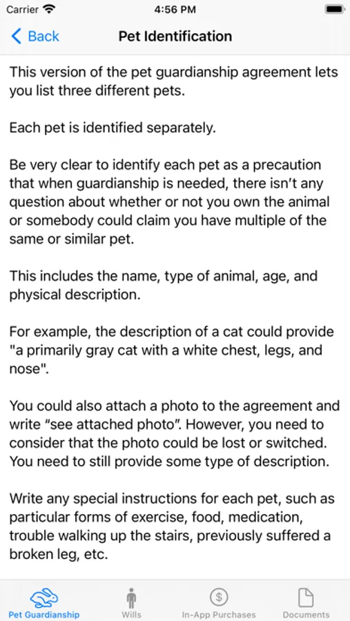 The free version of this app provides a tutorial about how to complete both a pet guardianship agreement for animals and Will for yourself. The tutorial fully explains each provision of these documents from an informational perspective. Actual Illinois laws are included for users to learn about the legal requirements for a Will.