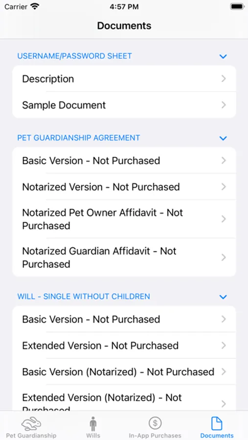 The Wills portion of the app includes the following options that range from $1.99 to $5.99 each (iOS version only).