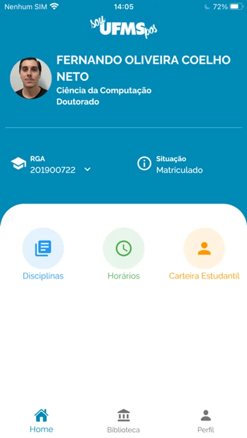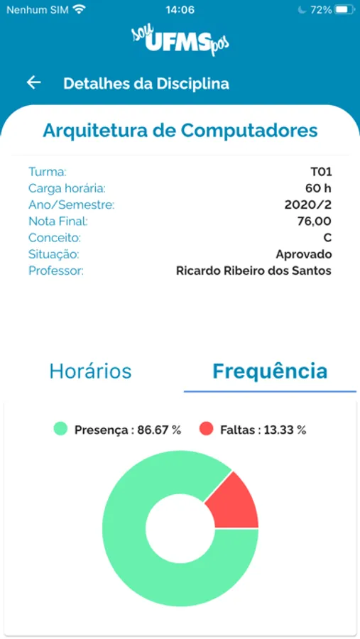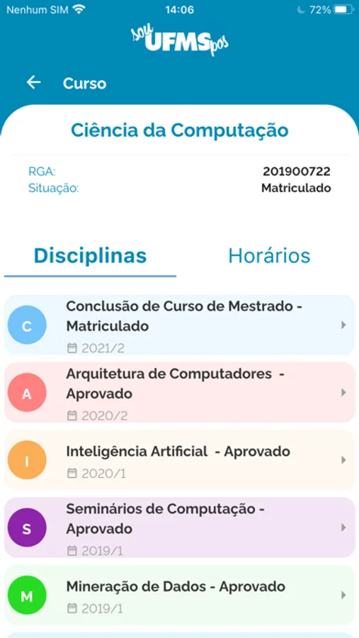 Este aplicativo visa auxiliar os acadêmicos de pós-graduação a consultarem informações relevantes como suas notas, frequências e horários de cada disciplina durante sua trajetória na UFMS.