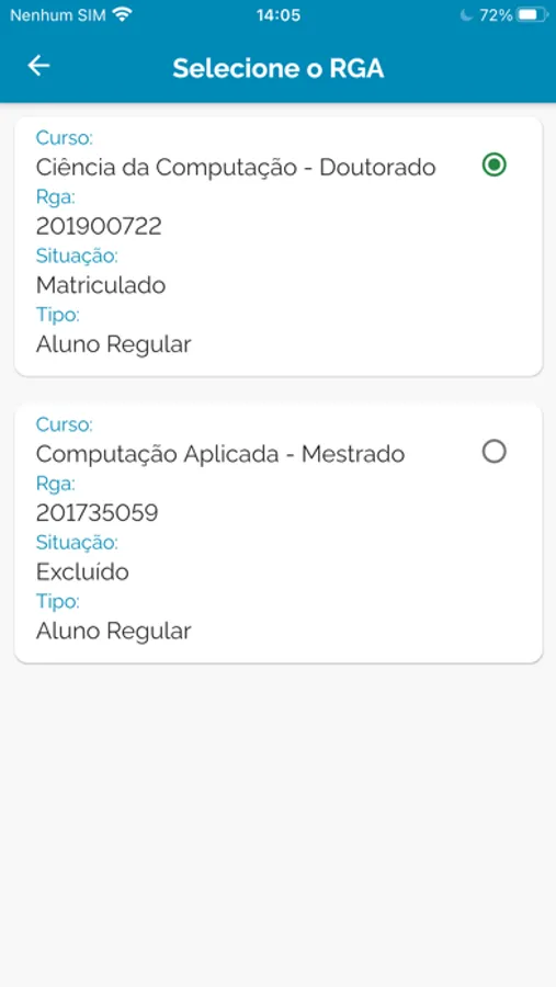 O acadêmico precisa usar seu passaporte e senha para acessar os dados do aplicativo. Após o acesso, serão exibidos seus RGAs ativos e inativos para que possa consultar os dados das disciplinas de cada semestre em que esteve matriculado.