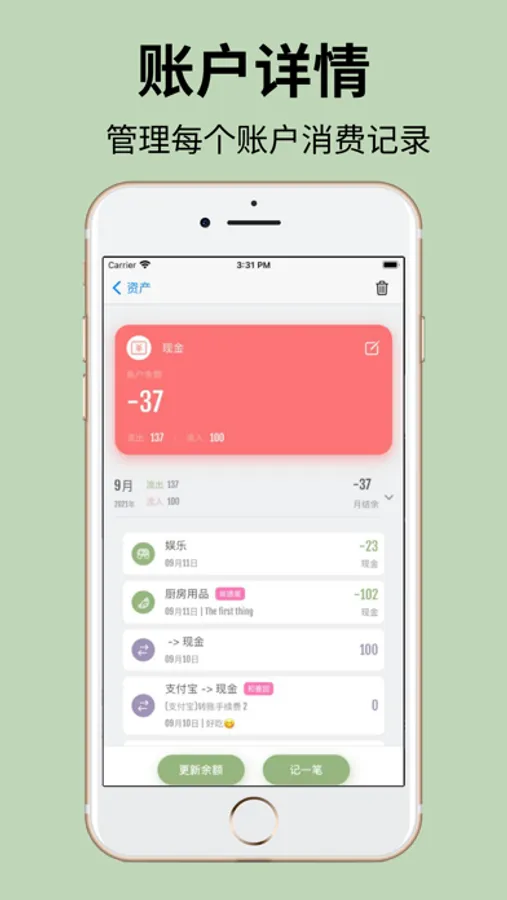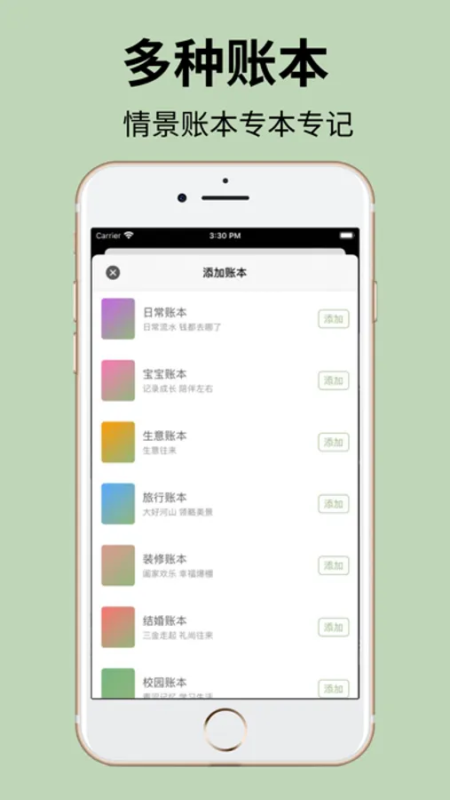 * 多账本功能:支持日常、宝宝、生意、旅行、装修、结婚、校园、汽车账本。