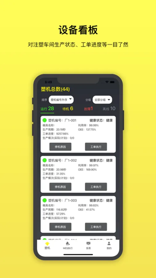【设备看板】:对注塑车间生产状态、工单进度等一目了然
