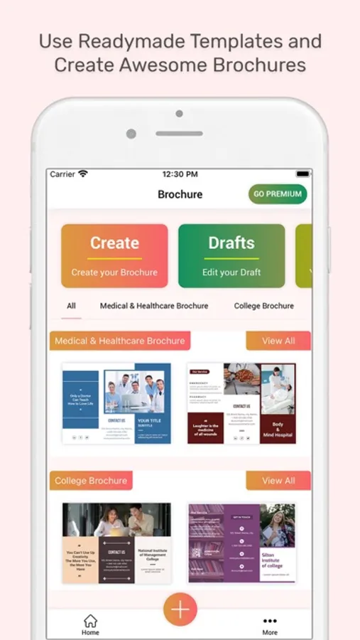 Brochure Pamphlet Maker App has huge collection of readymade brochure templates with category wise. User can search template and choose it and just tap to start editing.
