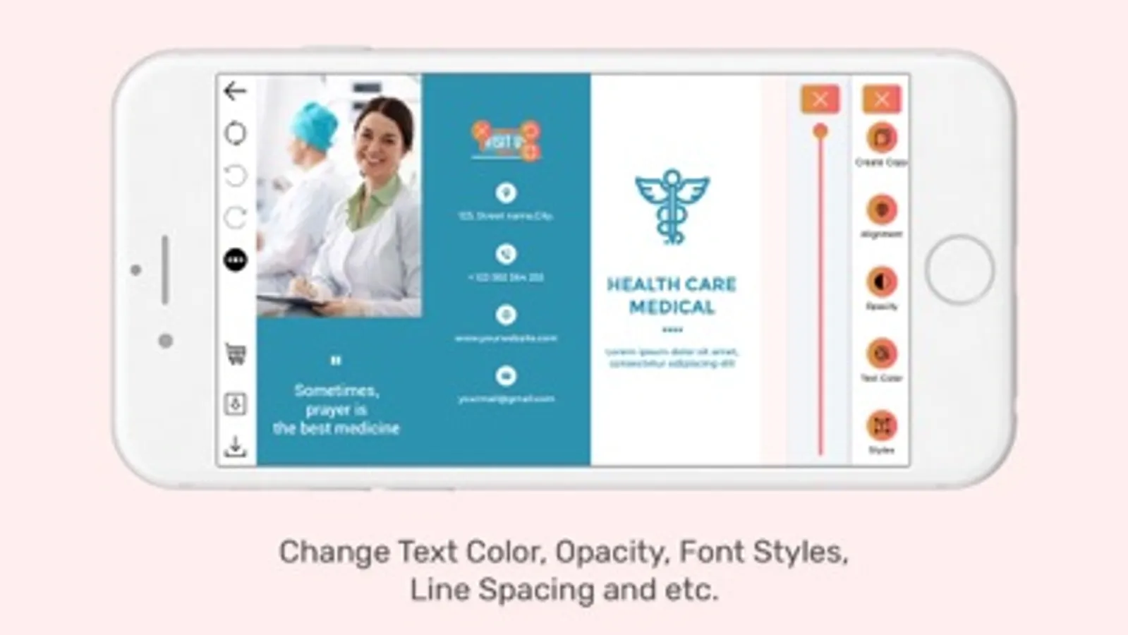 Easy to use option for users like add sticker, text, move around the brochure area, change text color, opacity, rotation, flip sticker, apply shadow and many more customisation options are available.