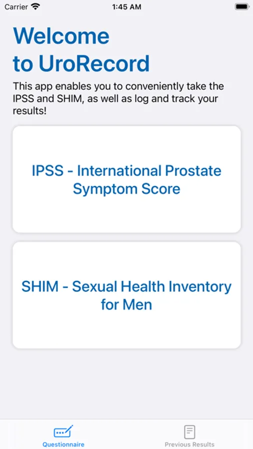 UroRecord is a powerful app that enables you to conveniently take the International Prostate Symptom Score and the Sexual Health Inventory for Men, as well as log and track your results!
