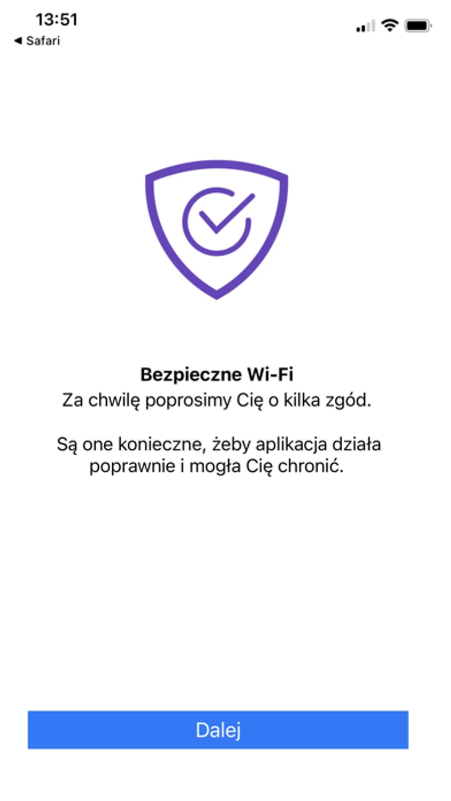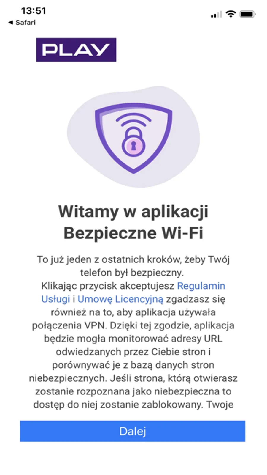 Bezpieczne Wi-Fi to aplikacja dostępna dla Użytkowników, którzy aktywowali Pakiet bezpieczeństwa w Play. Dzięki tej aplikacji zyskujesz rozszerzenie ochrony Bezpiecznego internetu, również kiedy korzystasz z sieci przez Wi-Fi.