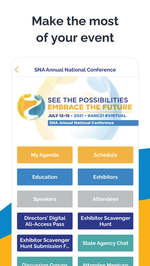 With the SNA Virtual ANC 2021 Mobile App, registered attendees will have the entire School Nutrition Association 2021 Virtual Annual National Conference event at their fingertips! Hosted on the Swapcard platform, the app the app mimics all of the features on the desktop version and allows you to access all the conference educational content, take part in live chats, tour virtual exhibit booths, make appointments with industry representatives, and chat with other attendees, all from the convenience of your mobile device. Select your favorite sessions to build your personal conference itinerary and export your schedule for easy reference. With AI-powered networking similar to social media applications, after you fill out your profile the Swapcard mobile app can match you with other Virtual ANC attendees to connect with at whatever level is comfortable for you. You’ll be able to send connection requests, arrange a video call meeting, have one-on-one or group chats—event attend a session with a friend! Conference content will also remain available on demand to all attendees for 30 days after the event concludes on July 15, 2021.