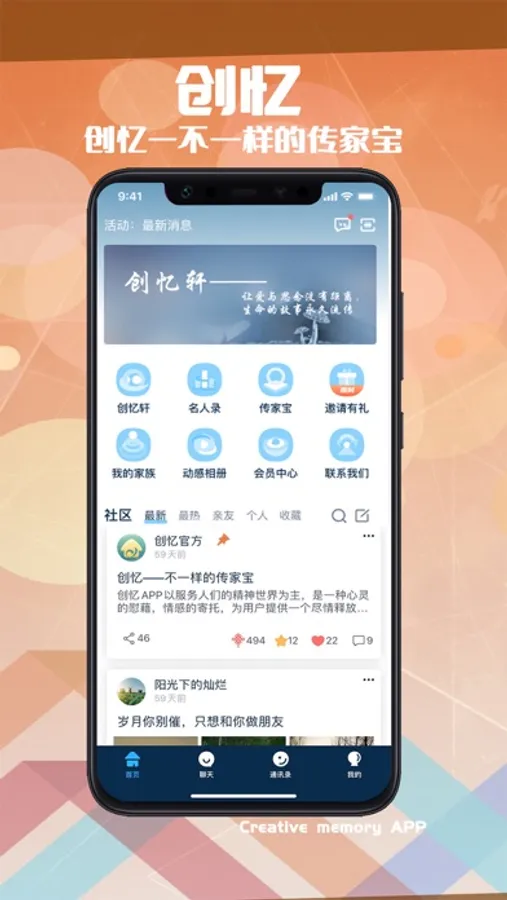 创忆APP是对”百善孝为先“与时俱进的表达,是对孝道与家族亲情的传承,创新形式,留忆亲人,让亲情不再因为距离而疏远,让亲人不再因为异乡的打拼而孤单,让您感受到亲情带来的爱和温暖!