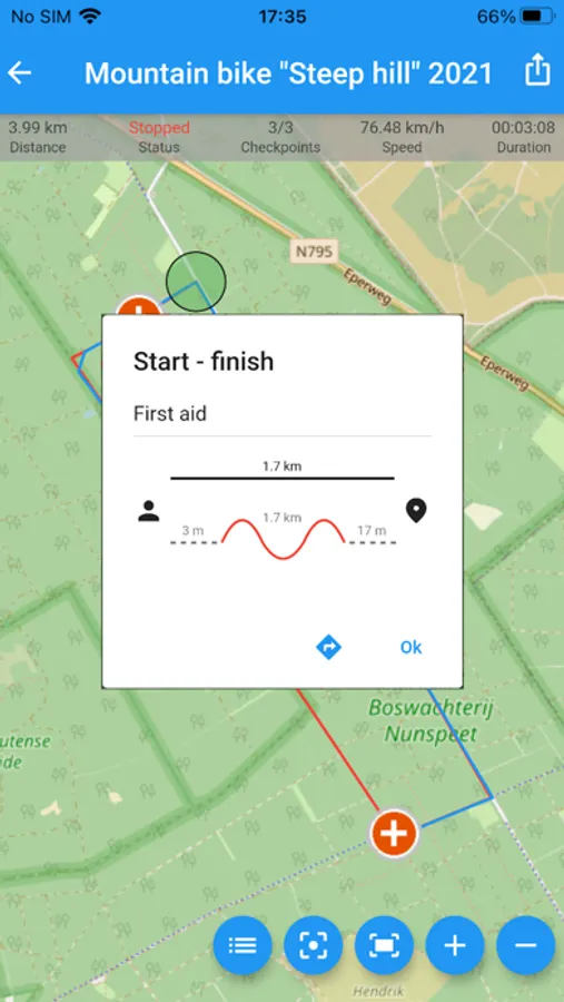 The route of the event, checkpoints and other important points along the route (first aid posts, restaurants, etc.) are shown on the map.