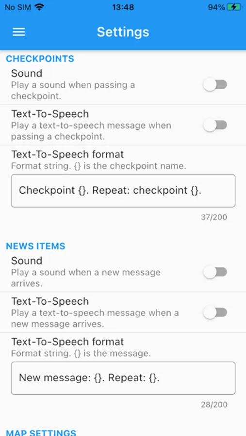 If the event organizer chooses, the App can receive real-time news messages about the event as well as real-time track updates. News messages can be played back via Text-To-Speech.
