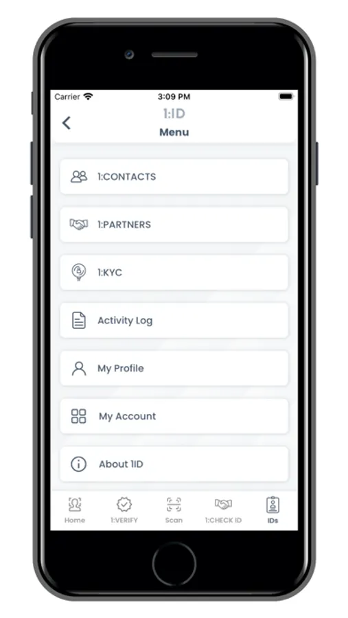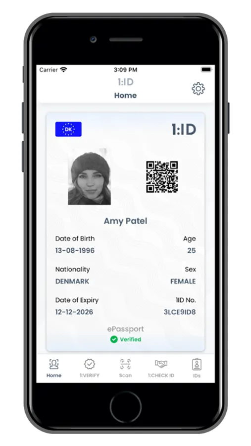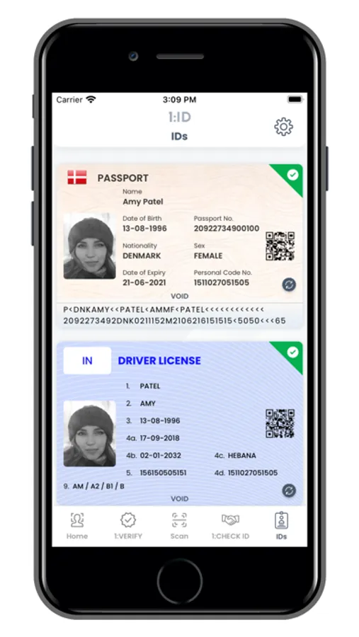 1ID is a digital profile to be used for personal identification and sharing of data. When you create a digital profile we NFC read your Passport, OCR scan your Driver License, and exhibit designed versions in the app. Be aware that these designs serve as illustrations ONLY, and are VOID as government issued IDs, and as such NOT validated NOR certified by issuing authorities.