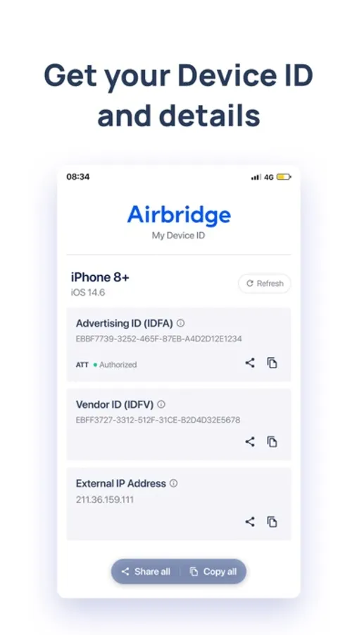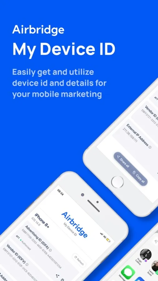 My Device ID는 Airbridge에서 제공하는 애플리케이션으로, 내 디바이스의 다음 정보들을 손쉽게 확인하고 복사 및 공유할 수 있습니다.