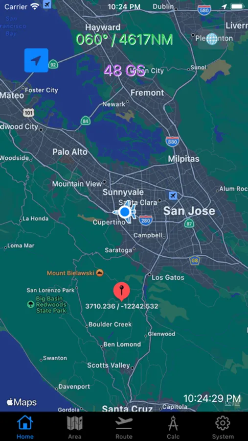 3. ミリタリーオペレーションに特化:Flight Navigatorは、ミリタリーオペレーションに必要な情報を提供します。常にBullseyeを基準にした自機位置を表示するほか、ピンを打った場所の座標、自機位置からの距離、Bullseyeからの距離、到達時間等を表示することが可能です。