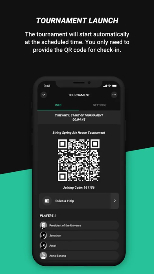 Scheduled tournaments start automatically on the desired date. As the organizer you don't have to do anything else, except to give the QR code to your guests. After that, you can fully concentrate on your activities and let your guests foos.