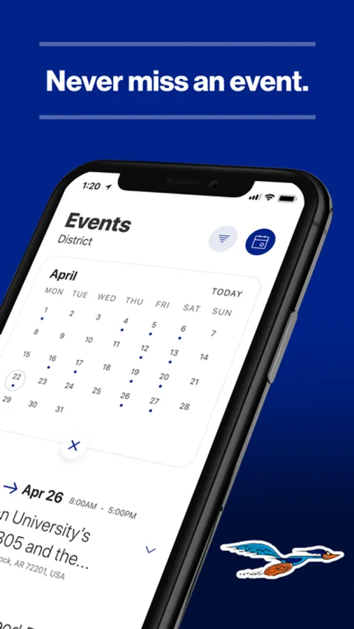 The event section shows a list of events throughout the district. Users can add an event to your calendar to share the event with friends and family with one tap.