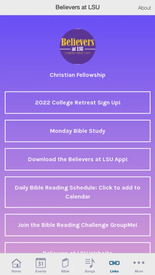 This app will help you stay connected with other Christians at LSU, read the Bible regularly and receive push notifications of all of our activities.