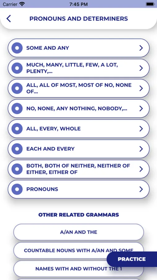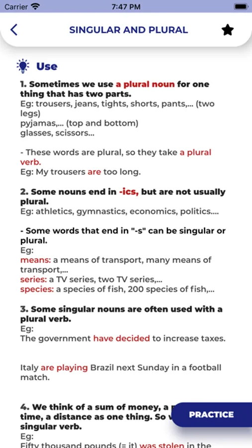 This English grammar app covers all 163 grammar points using clear explanations, real-life examples, and many tests to help you practice English grammar. A unique feature that we are proud of is that we provide many tips to help you realize grammar points, distinguish between similar grammars and how to use them in real-life situations.