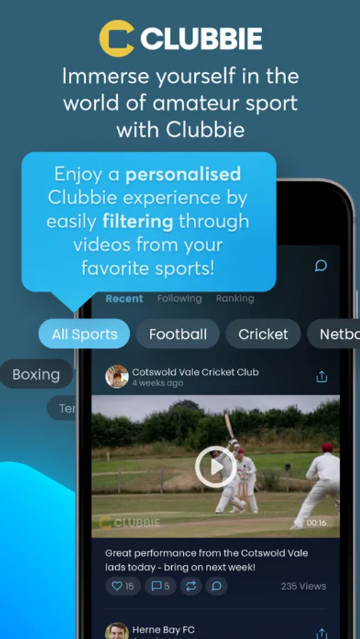 Showcase your sporting highlights to a likeminded community of amateur sport enthusiasts and enjoy a personalised Clubbie experience by seamlessly filtering through videos from your favourite sports. Celebrate, laugh, complete, triumph!
