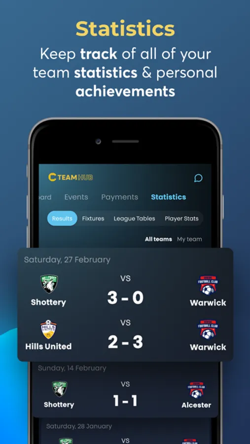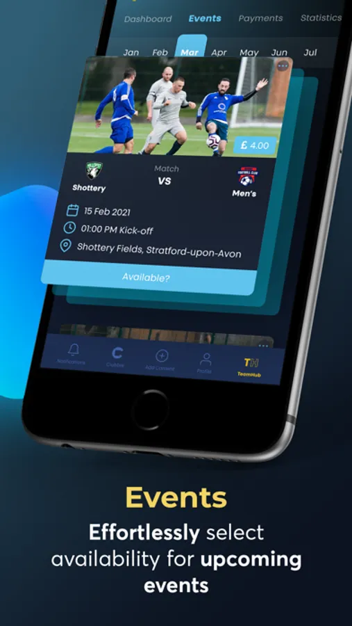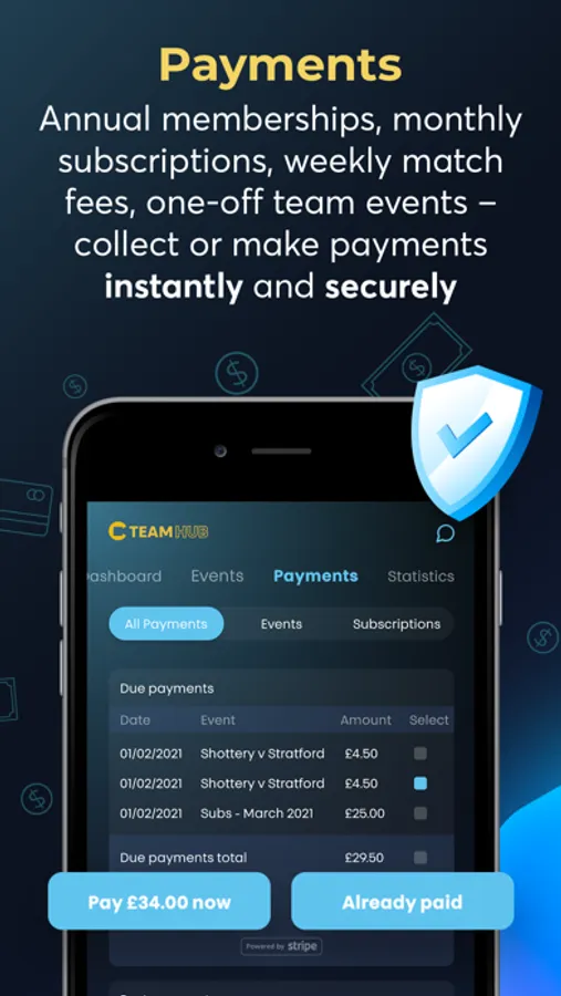 Effortlessly organise team events, create matchday line-ups, process all club payments instantly & securely and keep track of team stats & personal achievements all in one place!