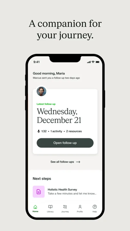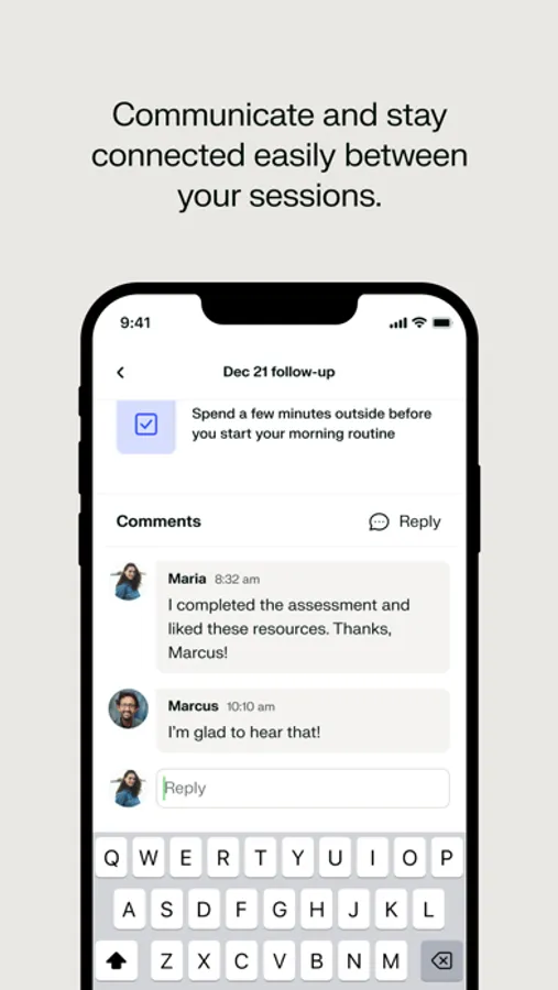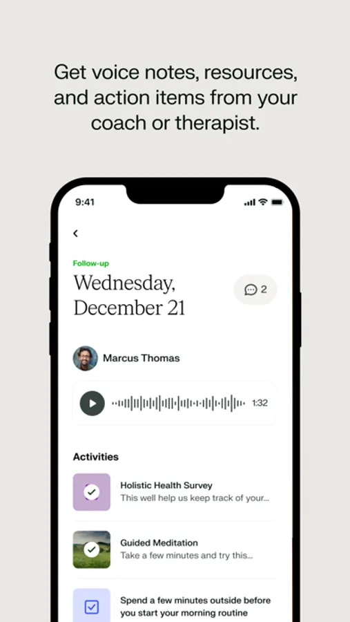 - Receive follow-ups from your coach or therapist, including voice notes and resources