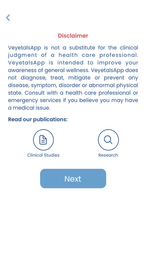 VeyetalsApp is an AI-based smartphone and tablet application that uses rPPG (remote photoplethysmography) tech with help of the smartphone camera or tablet to measure various vitals to detect your general wellness.