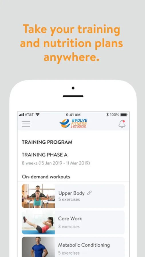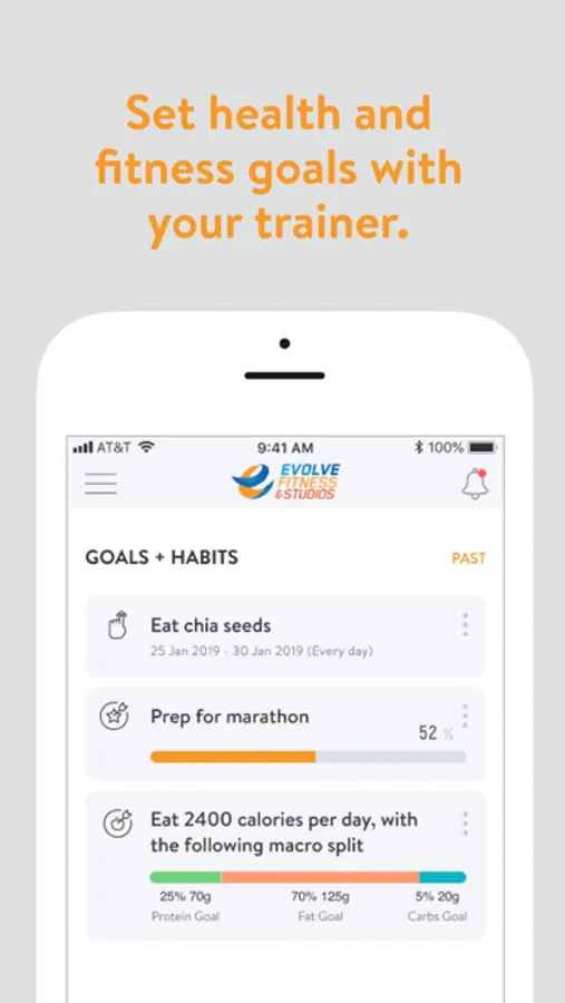 With the Evolve Fitness and Studios App, you can start tracking your workouts and meals, measuring results, and achieving your fitness goals, all with the help of your personal trainer.