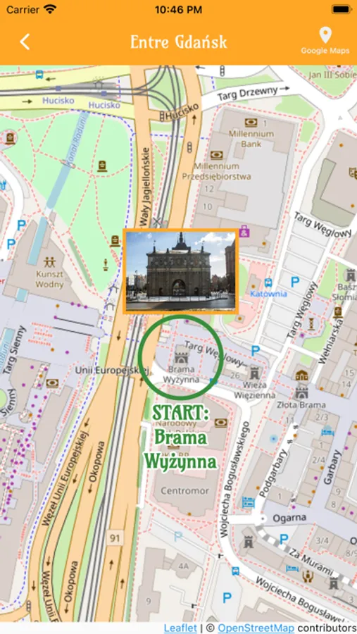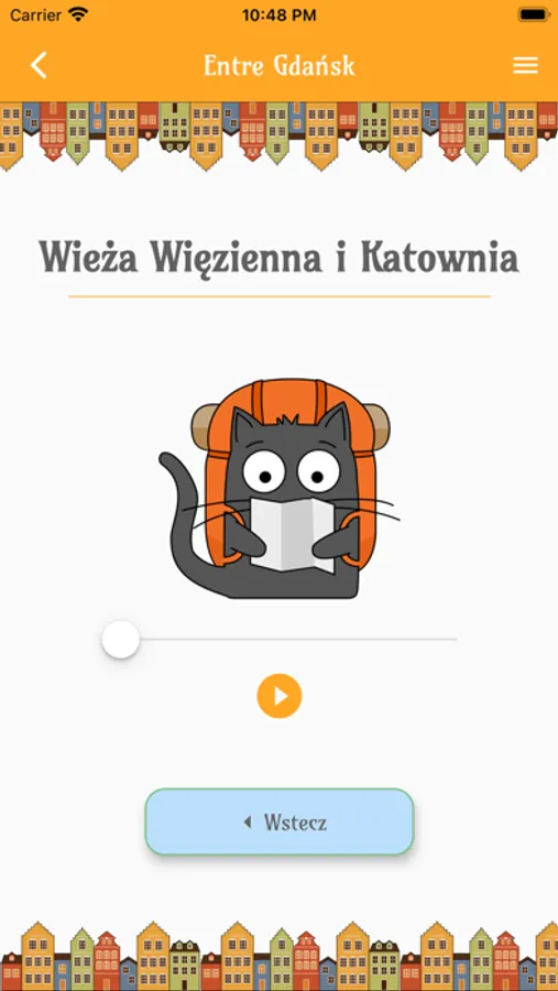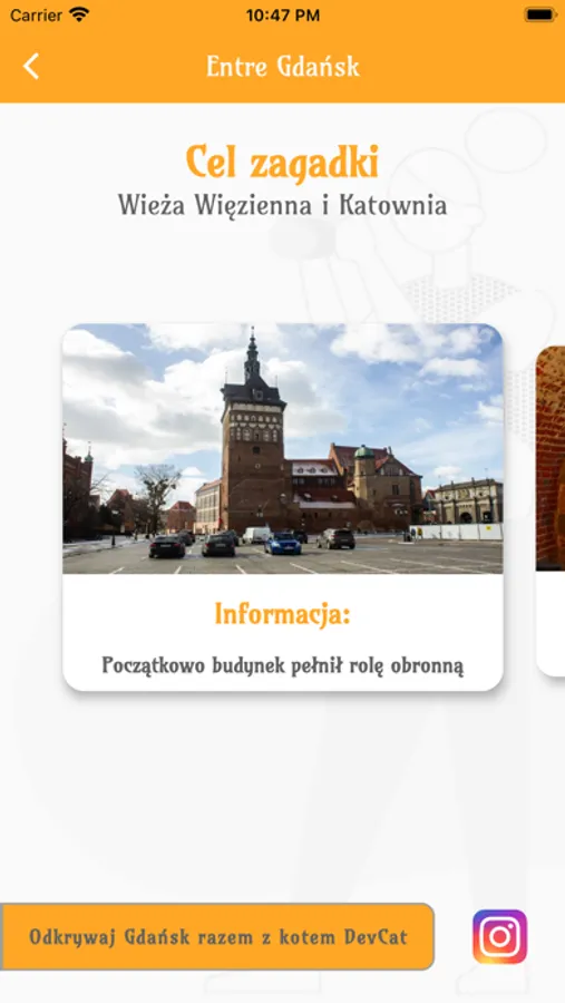 • The camera icon will take you to a place where brief information about a given monument is presented - description, curiosity, date of construction and information about what is nearby. You can also visit the Entre Gdansk Facebook profile and check the featured site's page by clicking the text in the lower-left corner.