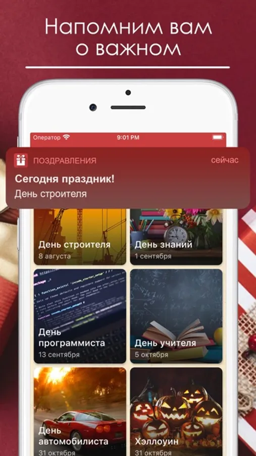 Не забудьте разрешить приложению отправку уведомлений, ведь тогда Вы не пропустите ни одни праздник! Уведомление приходит в праздничную дату в 10 часов утра.