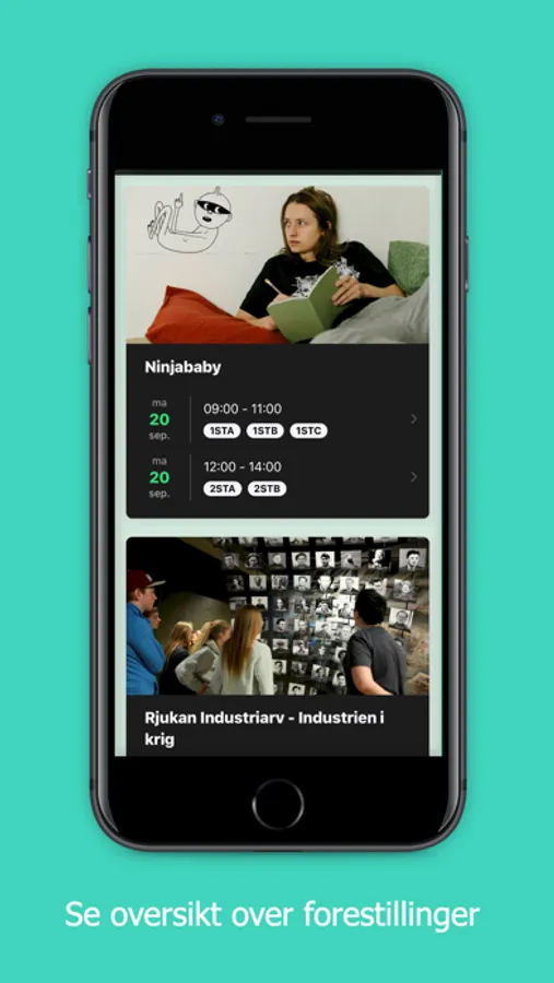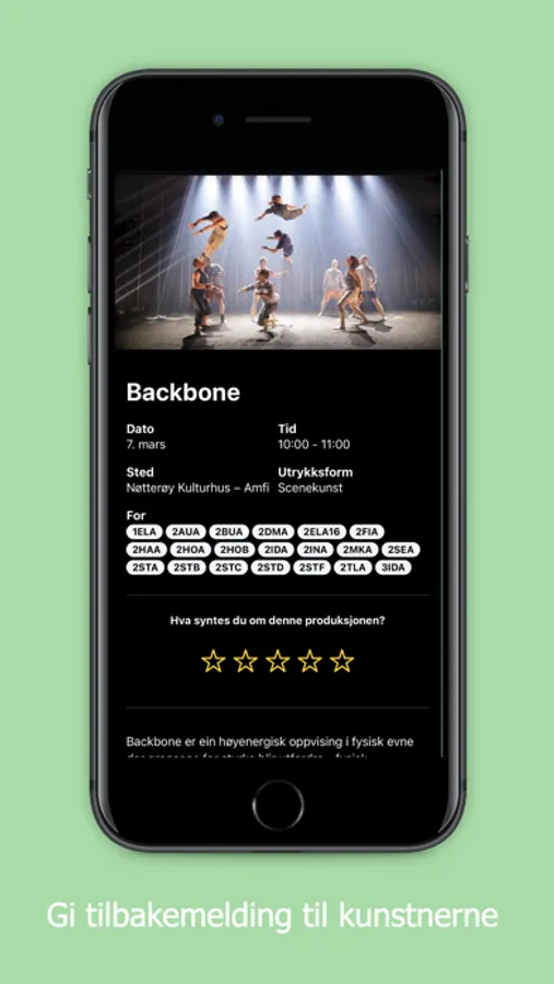 Her kan du se alle forestillingene på din videregående skole, få påminnelse om forestillinger samt gi tilbakemeldinger til kunstnerne.