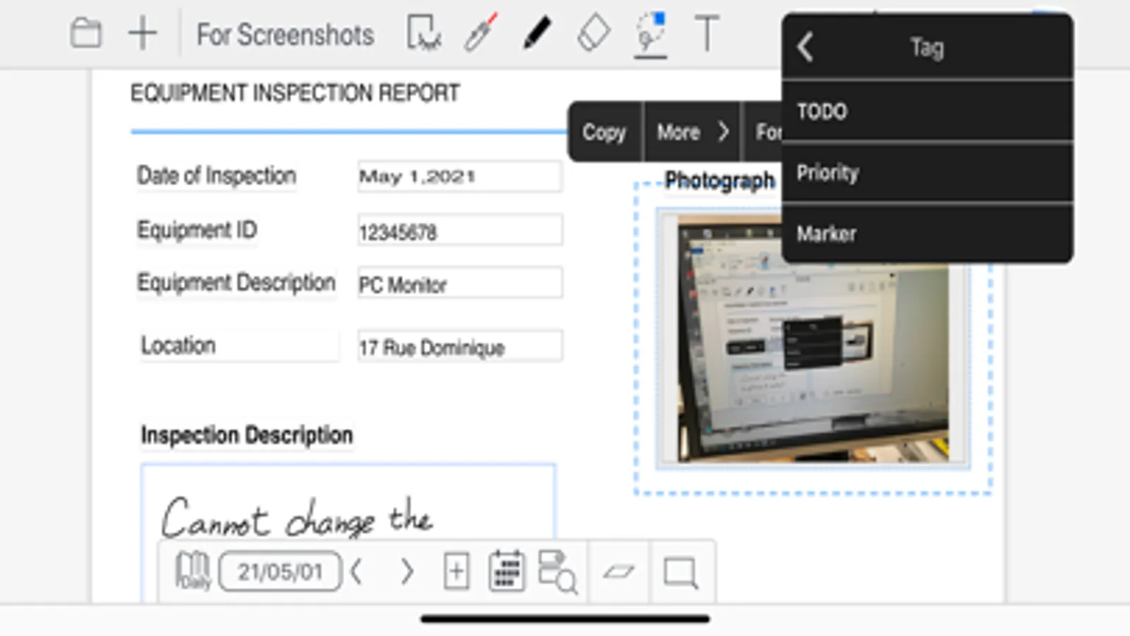 ● Add photos of the area or object to be inspected and attach to pins on an imported drawing from PDF or image.