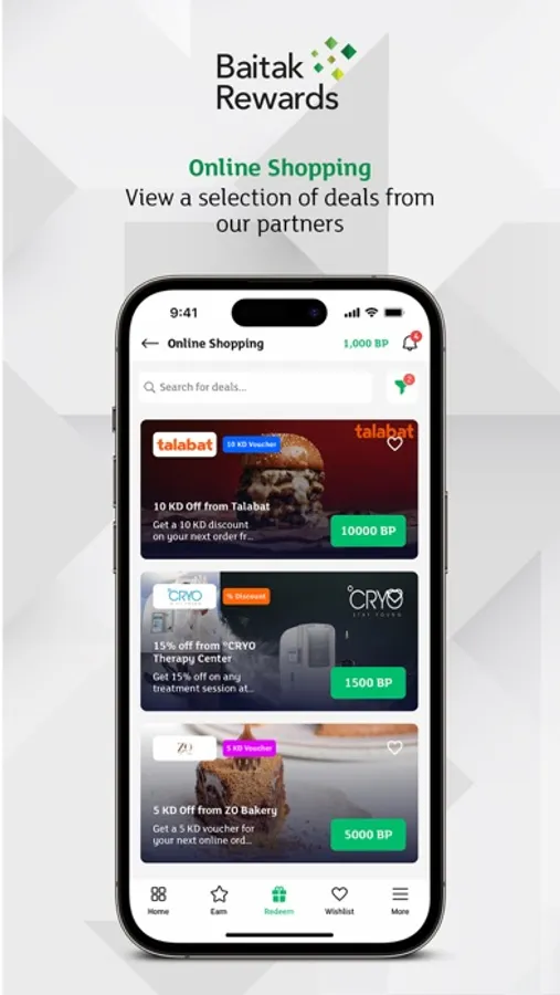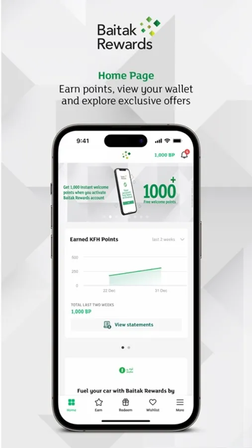 نقدم لكم أفضل برنامج مكافآت في الكويت ، KFH Rewards. بصفتك حاملًا لبطاقة بيتك ، يمكنك فتح عالم من الفرص من خلال ربح 10 نقاط بيتك مقابل كل دينار واحد تنفقه في المتاجر الشريكة المشاركة والاستمتاع بالمعنى الحقيقي للمكافآت باستخدام نقاط بيتك كوسيلة للدفع عبر أي مشارك. المتاجر الشريكة. يمكنك أيضًا فتح مجموعة متنوعة من الصفقات والعروض الحصرية من خلال التسوق عبر الإنترنت. بصفتك حاملًا لبطاقة KFH متوسطة أو عالية المستوى ، ستحصل على مكافآت في كل مرة تقوم فيها بتمرير بطاقتك ، أثناء التسوق محليًا أو في الخارج ، بالإضافة إلى ذلك ، يمكنك الوصول إلى جميع خيارات الاسترداد الخاصة ببرنامج KFH Rewards. بصفتك حاملًا لبطاقة فيزا إنفينيت ، يمكنك فتح جميع الامتيازات من خلال مضاعف نقاط بيتك الدائم الذي يبلغ x1.5 مقابل إنفاق بطاقتك عبر متاجر البيع بالتجزئة المفضلة لديك.