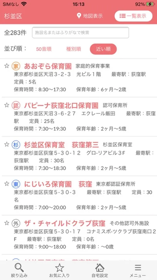 保育園の種類や、保育時間、受入年齢など色々な条件での絞り込みにも対応。