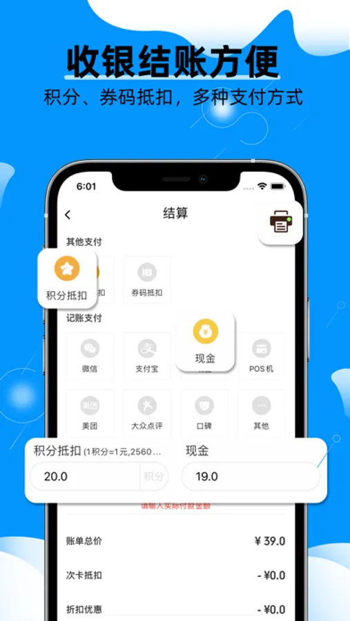 ①极速性收银:抛弃复杂收银操作,简化结账流程,10种支付方式,简单更快速