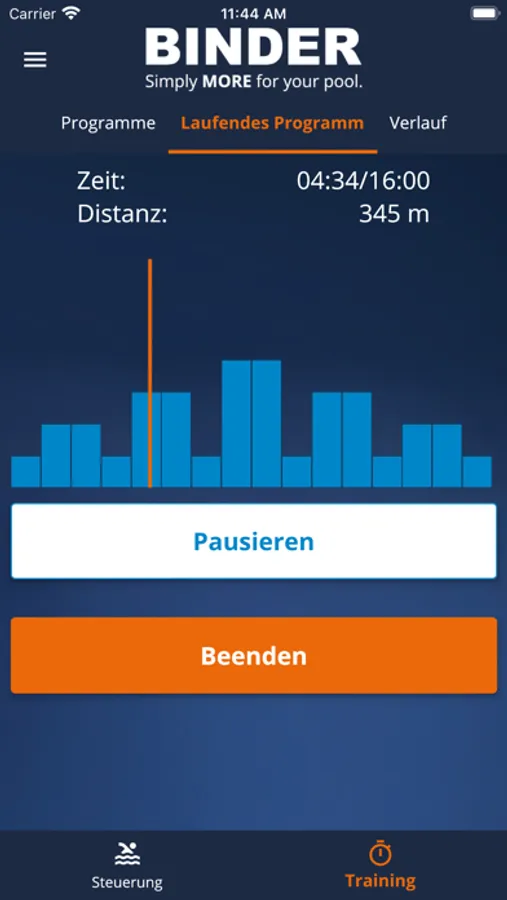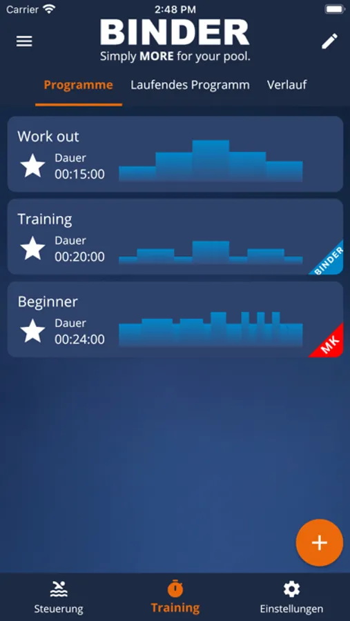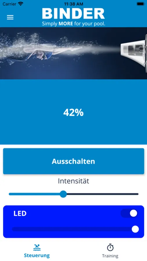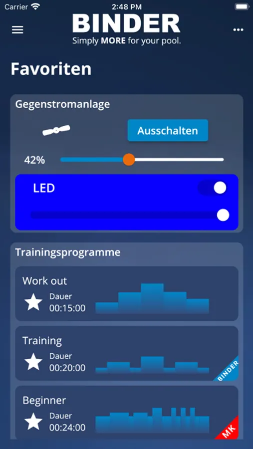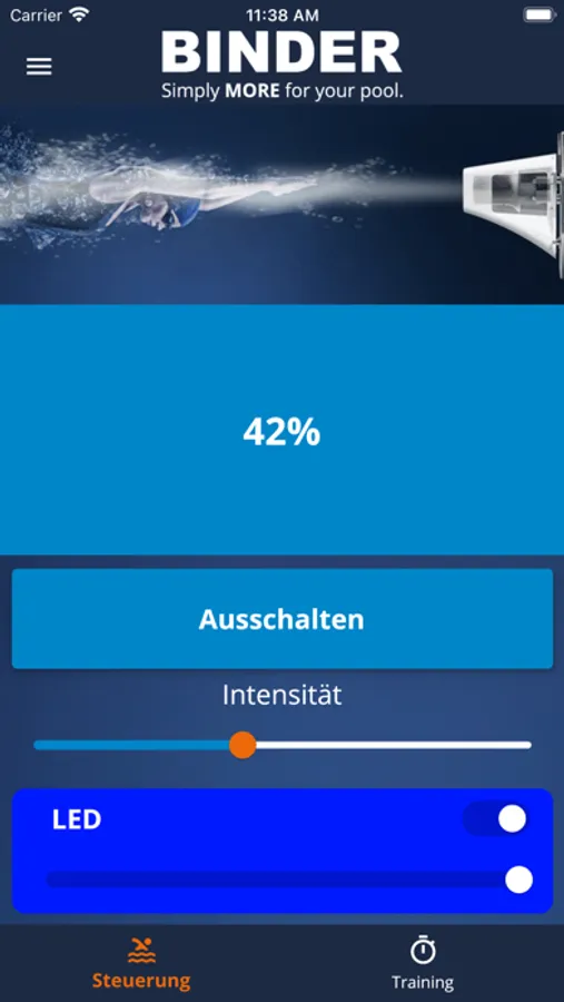 Binder's countercurrent system can be controlled with this app. It is possible to continuously adjust the intensity of the flow. It is also possible to create individual training programs.