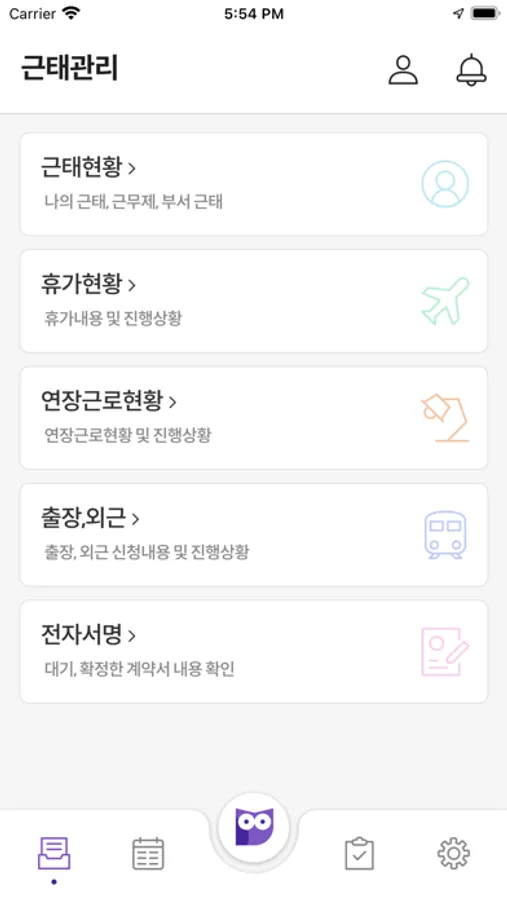 주요기능 : 출퇴근관리(mobile, pc on/off), 연장근무관리, 휴가 생성 및 사용관리, 52시간 근무제 및 유연근로제 적용 관리