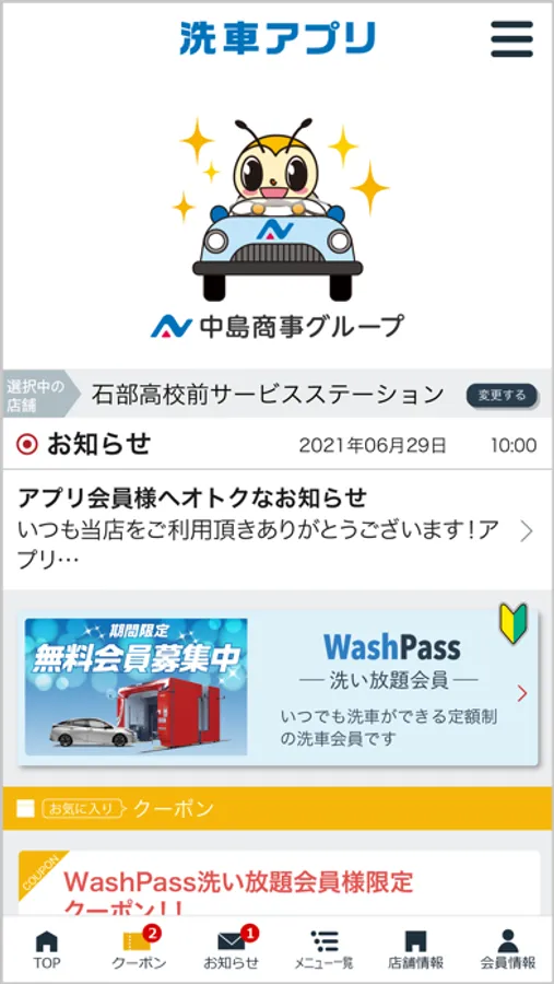 当社の公式アプリ「中島商事グループ《洗車アプリ》」ではWashPass(セルフ洗車機 洗い放題会員)のお申し込み・お支払い・ご利用いただけます。またアプリにて当店で利用いただけるお得なクーポンや各種メニューの割引情報を配信しております。