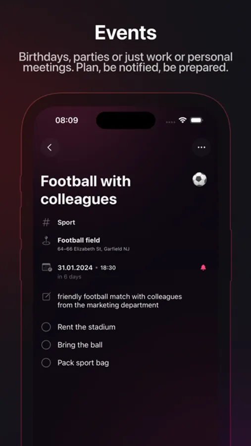 Create checklists for everything you desire! Generate tasks and subtasks, and easily share your lists with others using Wheeldone Spaces or by sending them directly. Take advantage of reminders and scheduling features. Additionally, set specific locations to receive automatic reminders for arrivals or departures.