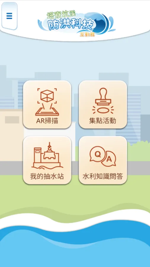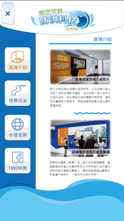 即颱風豪雨來臨時的操作應變計畫,透過防洪科技互動館導覽APP,可遊玩本次防洪科技互動館中的AR互動,以及團體問答遊戲,