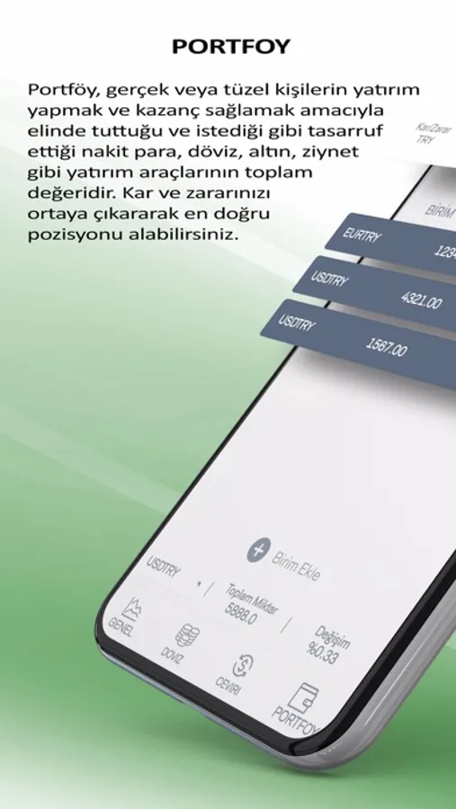 Portföy, gerçek veya tüzel kişilerin yatırım yapmak ve kazanç sağlamak amacıyla elinde tuttuğu ve istediği gibi tasarruf ettiği nakit para, döviz, altın, ziynet gibi yatırım araçlarının toplam değeridir. Kar ve zararınızı ortaya çıkararak en doğru pozisyonu alabilirsiniz.