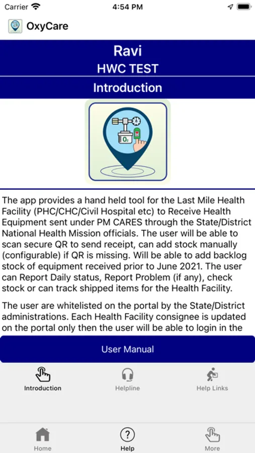 The app provides a hand held tool for the Last Mile Health Facility (PHC/CHC/Civil Hospital etc) to Receive Health Equipment sent by MoHFW,GoI through the State/District National Health Mission officials. The user will be able to scan secure QR to send receipt. The user can Report Daily status, Report Problem (if any), check stock or can track shipped items for the Health Facility. In case any PSA is installed in the HF, the live PSA Dashboard is also available.