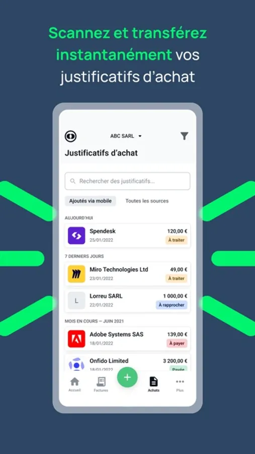 - Filter the receipts of the selected company (status, issue, due date, supplier, amount, creation)