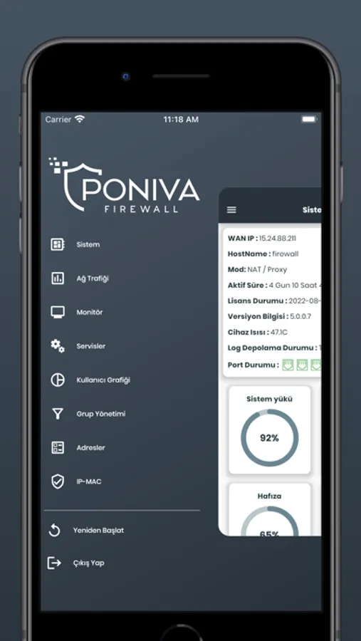 With the Poniva Manager application, you can instantly view system information, device resource consumption, service status, user and network traffic.