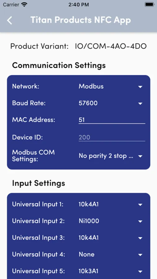 The Titan Products NFC commissioning app allows quick and simple set up of BACnet or Modbus network parameters, along with the configuration of any inputs of compatible Titan Products smart devices. The intuitive app allows set up in seconds, with or without power, allowing the devices to then be connected to the system network or building management system.