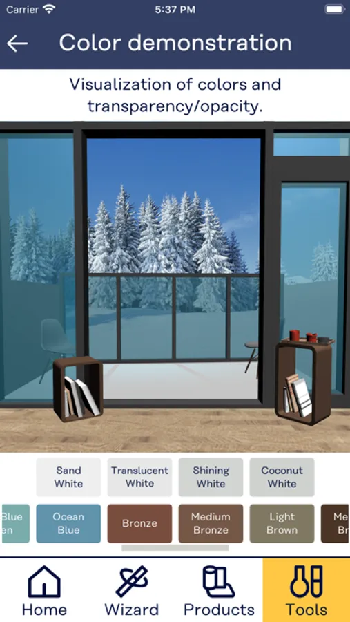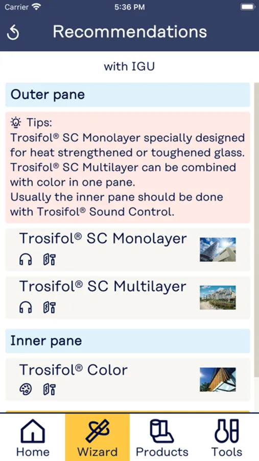 With our new "Solution Finder" app, we offer an ideal addition to the existing apps and valuable recommendations for action for projects in the planning status. After a few inquiries about general conditions, it gives recommendations on Trosifol® PVB and SentryGlas® ionoplast products that allow the desired projects to be implemented. The user can e.g. choose whether he needs soundproofing properties, show colors or want to implement special UV conditions. The app then suggests various Trosifol® or SentryGlas® products and shows further information. Some features are demonstrated even more clearly, such as graduated noise protection measures, which can be compared with each other under different background noise like aircraft or traffic noise. Or colors: different shades of white with different degrees of translucency allow alternating views. The entire color range is also clearly displayed.